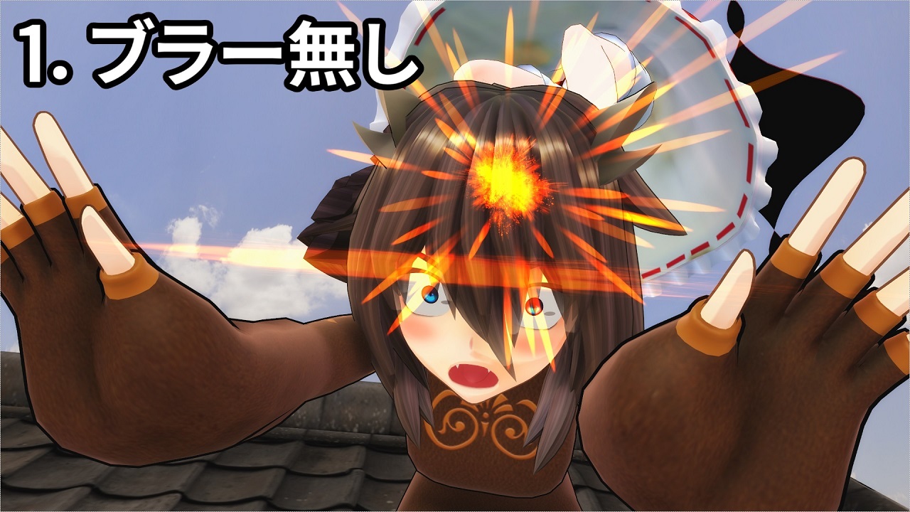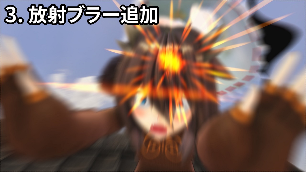これらのブラーは以前より取り入れていました。動きにブレができるようMMD上ではMotionBlurというエフェクトを使い、攻撃ヒット時に放射ブラーがつくようにAviutl上で編集を行う。ここまではやっていたのです。