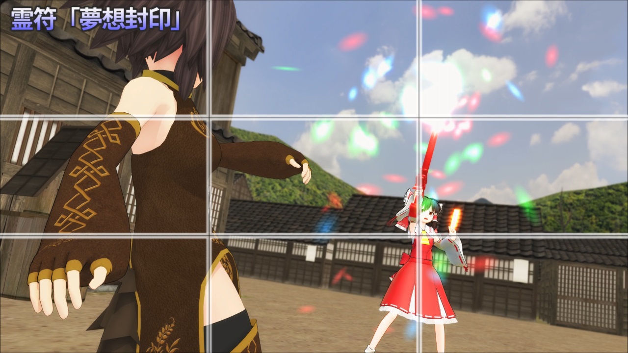 たとえば上の図では左側の交点近くにレプティが、右側の交点に霊夢と夢想封印オーラが配置されています。交点を意識してモノを配置すると、映したいものが強調されるうえに画面が整理される傾向があります。
